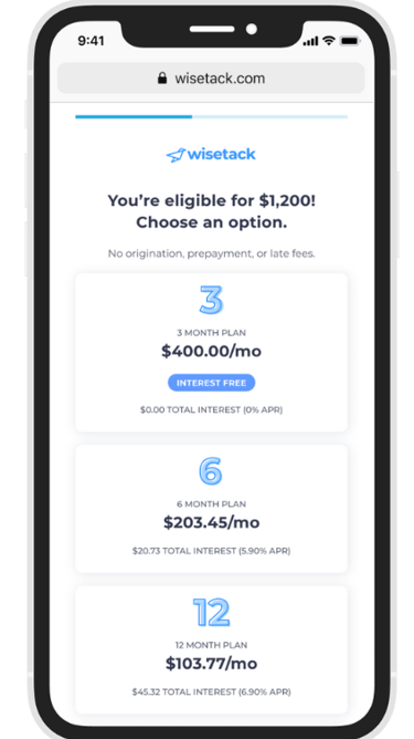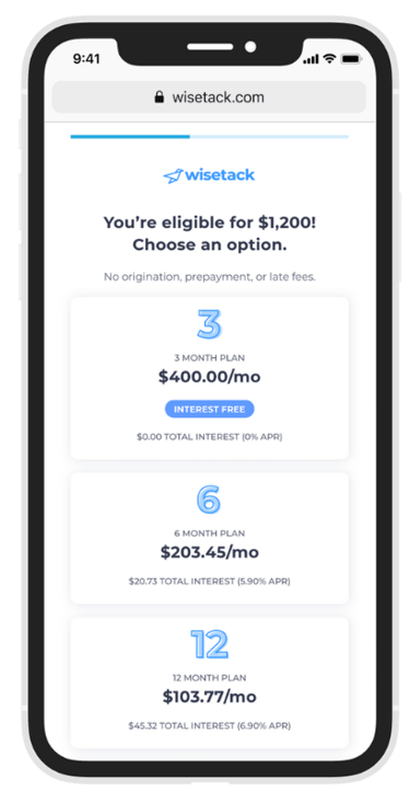 *All financing is subject to credit approval. Your terms may vary. Payment options through Wisetack are provided by our lending partners. For example, a $1,200 purchase could cost $104.89 a month for 12 months, based on an 8.9% APR, or $400 a month for 3 months, based on a 0% APR. Offers range from 0-35.9% APR based on creditworthiness. State interest rate caps may apply. No other financing charges or participation fees. See additional terms at https://wisetack.com/faqs.